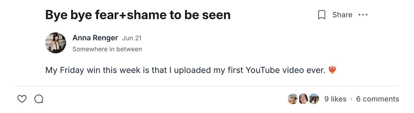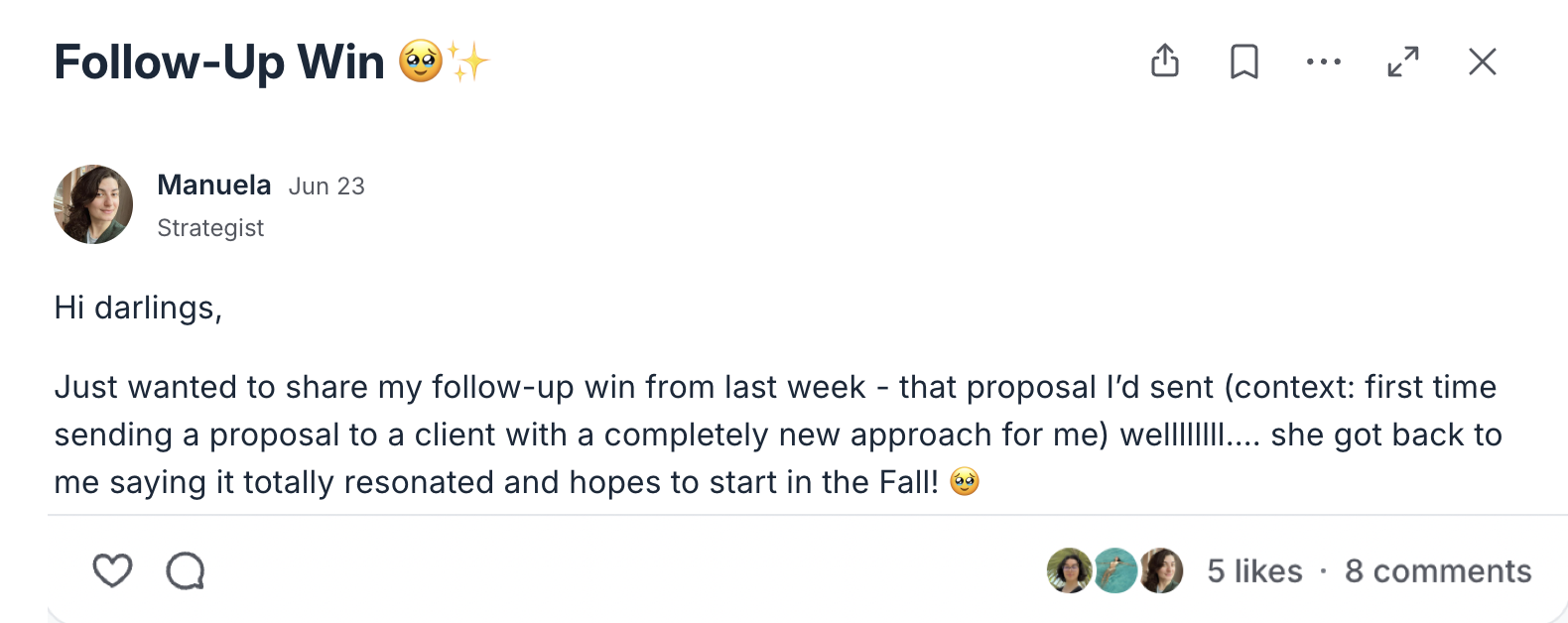 Your space to ask unlimited questions, share your work in progress, get feedback, celebrate your wins, deepen connections with other creators, and tap into the most potent antidote for stagnation: co-created momentum.
